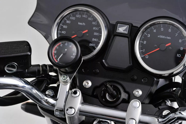 High quality analog VELONA48 voltmeter for monitoring the battery voltage of the motorcycle, Stepper motor with precise volt display, Voltmeter Range: 8,0 - 16,0V, Battery warning: Low voltage alert by Red LED backlight when less than 12V, Stainless steel housing, Incl. V-shaped bracket