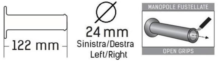 Pair Grips for BMW motorcycles with Heated grips Material: Thermoplastic rubberColour: BlackLength: 120 mmInternal Diameter: 24 mmOpen End Color: Black Grip_compound: Single compound Grip_type: Ergonomic Lock-on: Non