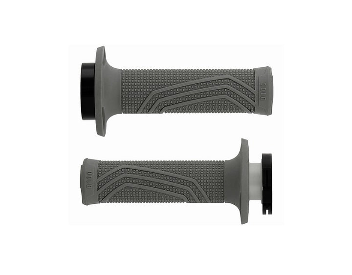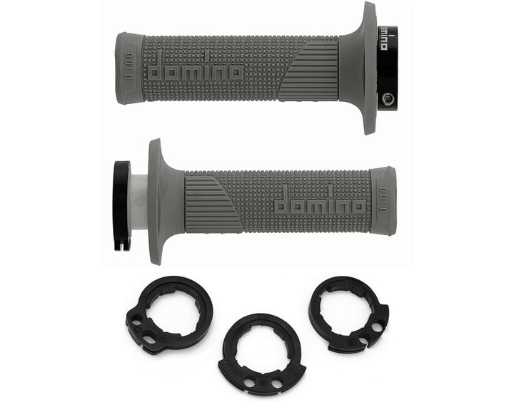 «HIGH GRIP» technology: The knurling – Domino patented – maximizes the grip in any direction and the adherence between grips and gloves An index-thumb pad and the 3 clings waffle on the back increase the grip Material: Thermoplastic rubber Colour: Orange Handlebar Diameter: 22 mm Length: left 125 mm / right 130 mm Grips Lenght: 116 mm Grip end: Closed Flange diameter: 61,5 mm Handle Diameter: 30 mm Color: Grey Grip_compound: Single compound Grip_type: Full Diamond Lock-on: Oui