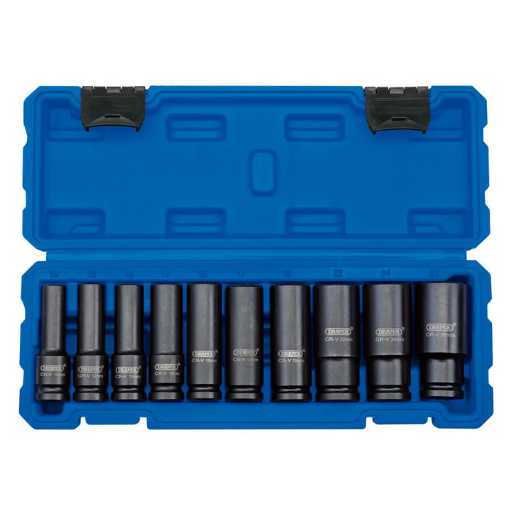 Sockets forged from chrome vanadium steel hardened, tempered and chemically blacked for corrosion protection. Hole for accessory spring loaded ball. Packed in plastic storage case.Safety Note: ONLY impact sockets and accessories can be used with air or electric powered wrenches. NEVER use silver chrome vanadium steel sockets which can shatter and cause personal injury. 10, 12, 13, 14, 15, 17, 19, 22, 24, 27mm