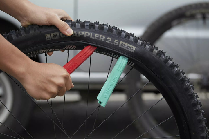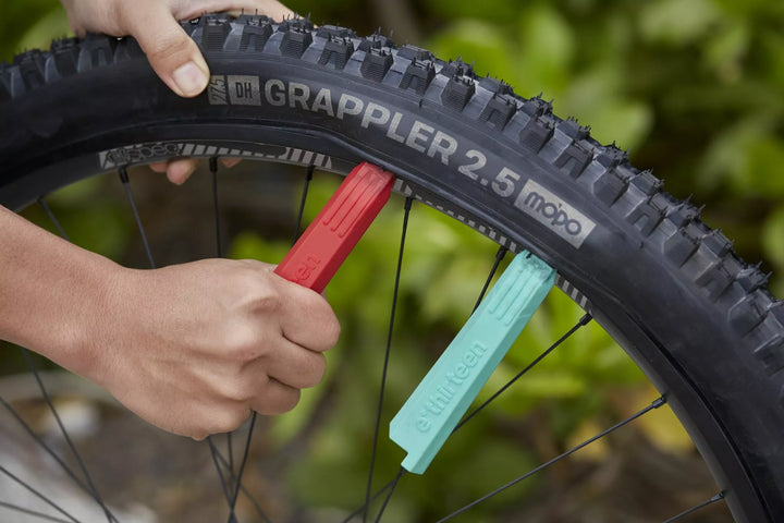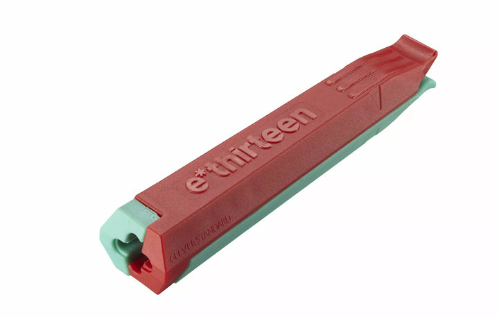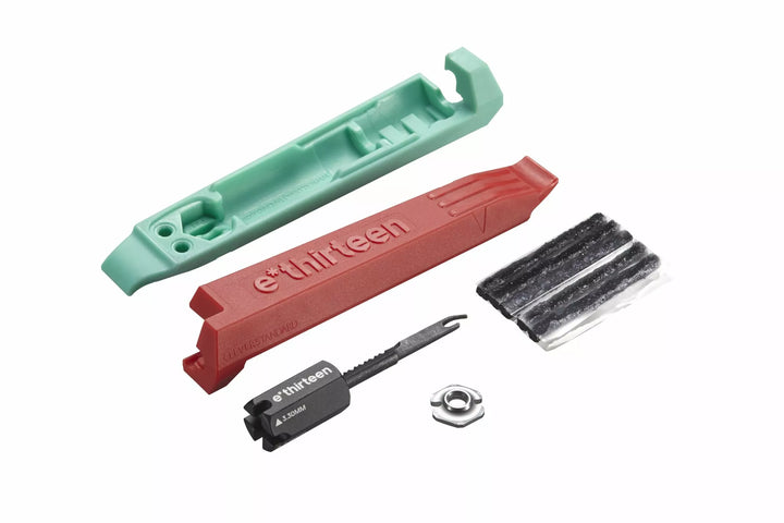 Take the frustration out of flat tires with e*thirteen’s Tire Lever and Plug Repair Kit., This handy and compact tool is a combination of 2 sturdy composite tire levers which encase a tire plug needle and 5x3.5mm self-adhesive plugs., The levers are multi-purpose engineered. They’re some of the toughest levers on the market, designed for DH casing tire use, act as a comfortable handle for the tire plug needle, making insertion into even the heaviest casing tires a breeze, and include 4 sizes of spoke wrenches, for spoke tension adjustments on the fly., Kit includes: 2 Composite Tire Levers designed for DH casing tire toughness + Puncture Plug Needle and 5 extra thick 3.5mm Self-Adhesive Plugs +3.23, 3.30, 3.45, 3.96mm Spoke Wrenches