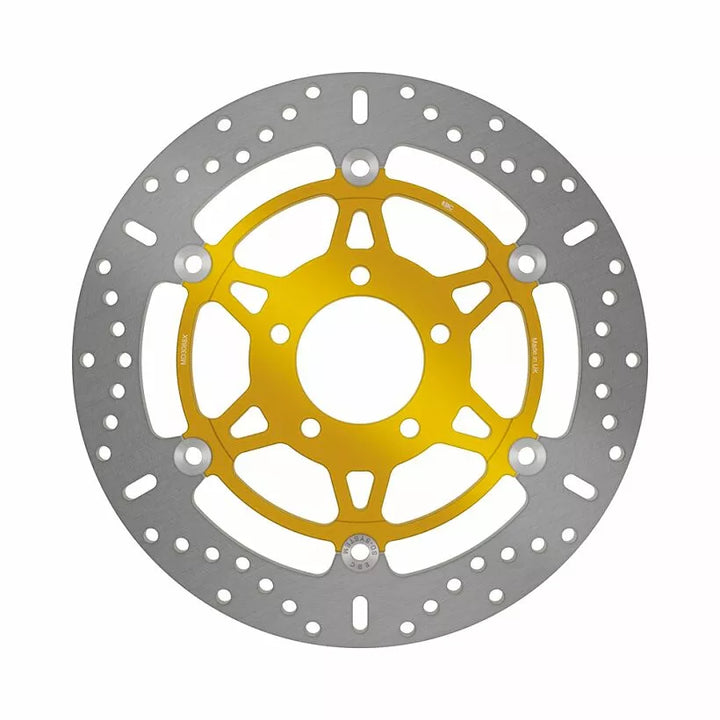 Ultra lightweight EBC Brakes X series floating front MC rotors since their introduction, have become one if the worlds best selling lightest and best performing discs available for all modern sport bikes. Floating MC rotors feature EBC Brakes unique and patented S-Drive button system which features square sided rivets captured in square drive pockets on the rotor and hub which allow the outer rotor blade to expand and contract freely under the heat of braking without suffering rivet lock., Hand built and inspected, Ultra lightweight but strong, Patented square drive button system (Floating rotors), Designed as an OEM improvement