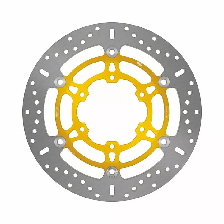 Ultra lightweight EBC Brakes X series floating front MC rotors since their introduction, have become one if the worlds best selling lightest and best performing discs available for all modern sport bikes. Floating MC rotors feature EBC Brakes unique and patented S-Drive button system which features square sided rivets captured in square drive pockets on the rotor and hub which allow the outer rotor blade to expand and contract freely under the heat of braking without suffering rivet lock., Hand built and inspected, Ultra lightweight but strong, Patented square drive button system (Floating rotors), Designed as an OEM improvement