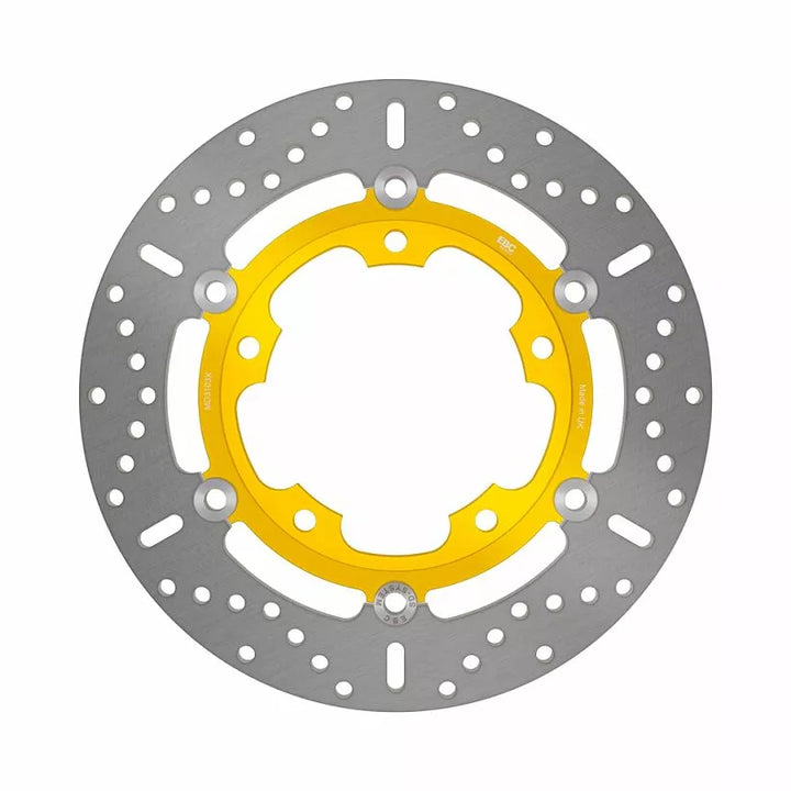 Ultra lightweight EBC Brakes X series floating front MC rotors since their introduction, have become one if the worlds best selling lightest and best performing discs available for all modern sport bikes. Floating MC rotors feature EBC Brakes unique and patented S-Drive button system which features square sided rivets captured in square drive pockets on the rotor and hub which allow the outer rotor blade to expand and contract freely under the heat of braking without suffering rivet lock., Hand built and inspected, Ultra lightweight but strong, Patented square drive button system (Floating rotors), Designed as an OEM improvement