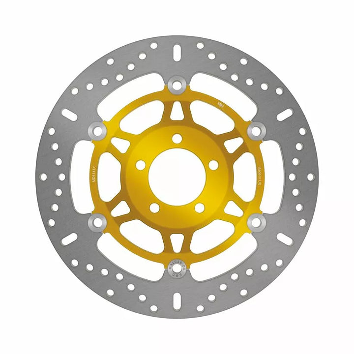 Ultra lightweight EBC Brakes X series floating front MC rotors since their introduction, have become one if the worlds best selling lightest and best performing discs available for all modern sport bikes. Floating MC rotors feature EBC Brakes unique and patented S-Drive button system which features square sided rivets captured in square drive pockets on the rotor and hub which allow the outer rotor blade to expand and contract freely under the heat of braking without suffering rivet lock., Hand built and inspected, Ultra lightweight but strong, Patented square drive button system (Floating rotors), Designed as an OEM improvement