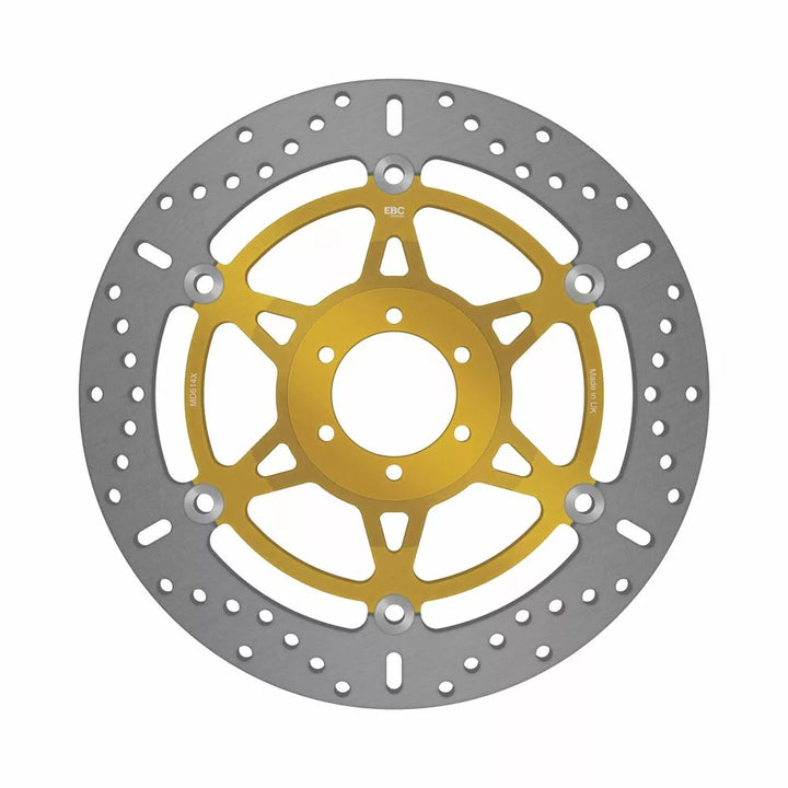 Ultra lightweight EBC Brakes X series floating front MC rotors since their introduction, have become one if the worlds best selling lightest and best performing discs available for all modern sport bikes. Floating MC rotors feature EBC Brakes unique and patented S-Drive button system which features square sided rivets captured in square drive pockets on the rotor and hub which allow the outer rotor blade to expand and contract freely under the heat of braking without suffering rivet lock., Hand built and inspected, Ultra lightweight but strong, Patented square drive button system (Floating rotors), Designed as an OEM improvement