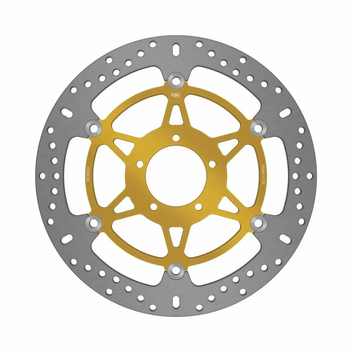 Ultra lightweight EBC Brakes X series floating front MC rotors since their introduction, have become one if the worlds best selling lightest and best performing discs available for all modern sport bikes. Floating MC rotors feature EBC Brakes unique and patented S-Drive button system which features square sided rivets captured in square drive pockets on the rotor and hub which allow the outer rotor blade to expand and contract freely under the heat of braking without suffering rivet lock., Hand built and inspected, Ultra lightweight but strong, Patented square drive button system (Floating rotors), Designed as an OEM improvement