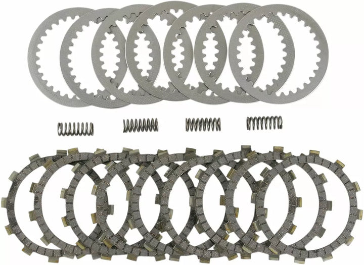 Anti-swell, alloy-impregnated heavy-duty cork-based facings for smooth clutch take-up, Allows modulation, unlike paper clutches that tend to snatch, Complete engine set of friction plates, HD springs and steel separator plates prevent premature driven plate wear, oil muddying and loss of stack height, Built with swagged aluminum carriers that spread the load on the clutch basket and prevent clutch basket "dogging", 10-15% uprated heavy duty clutch springs