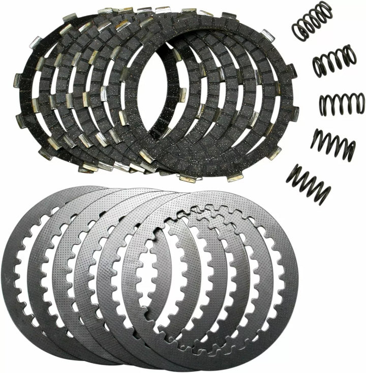 Anti-swell, alloy-impregnated heavy-duty cork-based facings for smooth clutch take-up, Allows modulation, unlike paper clutches that tend to snatch, Complete engine set of friction plates, HD springs and steel separator plates prevent premature driven plate wear, oil muddying and loss of stack height, Built with swagged aluminum carriers that spread the load on the clutch basket and prevent clutch basket "dogging", 10-15% uprated heavy duty clutch springs