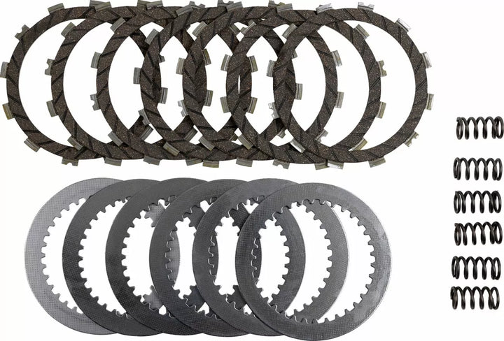 Anti-swell, alloy-impregnated heavy-duty cork-based facings for smooth clutch take-up, Allows modulation, unlike paper clutches that tend to snatch, Complete engine set of friction plates, HD springs and steel separator plates prevent premature driven plate wear, oil muddying and loss of stack height, Built with swagged aluminum carriers that spread the load on the clutch basket and prevent clutch basket "dogging", 10-15% uprated heavy duty clutch springs