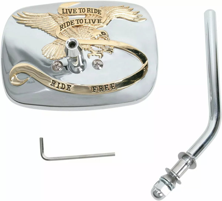 Allen wrench for setscrew, chromed acorn nut and necessary mounting hardware included, High-quality die-cast mirrors feature "Live to Ride...Ride Free" script, Miller mirror clamp part# DS-302020 is required. Fits 1" bar only.
