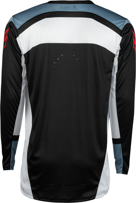Laser-cut perforations for advanced ventilationZero-cuffs provide unrestrictive mobility and a comfortable fitMesh ventilation panels dissipate unwanted heatMulti-panel construction for maximum performance and comfortable fitLow profile streamlined taped collarExtended tail helps keep jersey tucked inAthletic fit: fits close to the body with minimal excess Collection: 2024.0 Color: Black & Grey & White Size: M Use: MX
