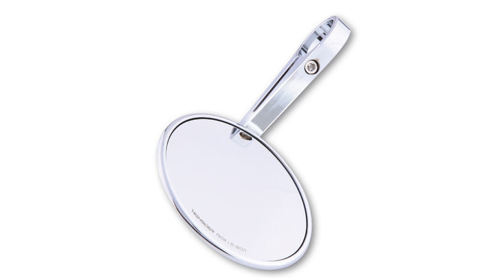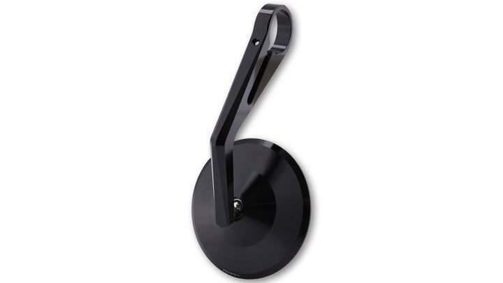 Universal handlebar end mirror, noble design, with a round head made of black anodized aluminum or chrome-plated. Fits 1" and 7/8" handlebars. Can be used for left and right side.