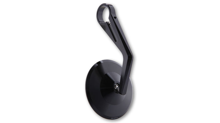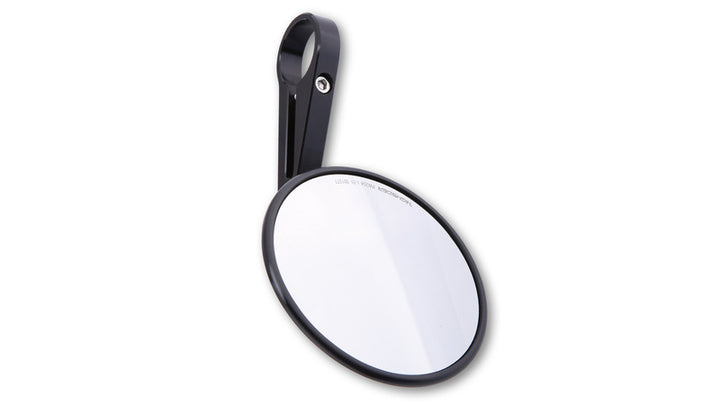 Universal handlebar end mirror, noble design, with a round head made of black anodized aluminum or chrome-plated. Fits 1" and 7/8" handlebars. Can be used for left and right side.