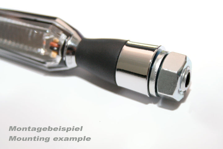 Aluminium spacer sleeve for almost all indicators with an M8 threaded bolt from Highsider. A slot in the sleeve facilitates the passage of the cables. Can be used either as a turn signal extension or as a spacer if the threaded bolt on the lamp holder should hit the inside of the lamp housing when attaching it to the lamp holder.