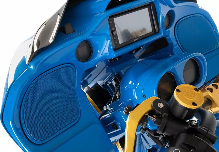 Outer fairing does not have to be removed to change grills, 1mm thick metal mesh grills come painted gloss black, Metal Mesh can be power coated, chromed, polished or painted, Grills are thick enough not to warp during finishing process, No corporate logos on grills, Can be used with most repacement speakers