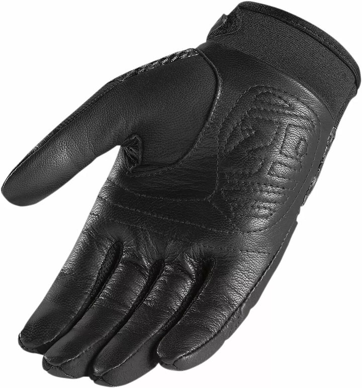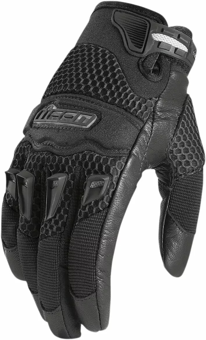 Icon’s MX-inspired street-specific riding gloves, Perfect for spring and summer riding, Ax Laredo™ palm with hi-flow backhand mesh for ventilation, Thermoplastic rubber knuckle armor, Glove features an Ax Laredo™ palm capable of hand-to-hand combat with gravel choked asphalt, Pre-curved palm and finger design, Synthetic leather finger gussets, Gloves EN 13594 : Level 1