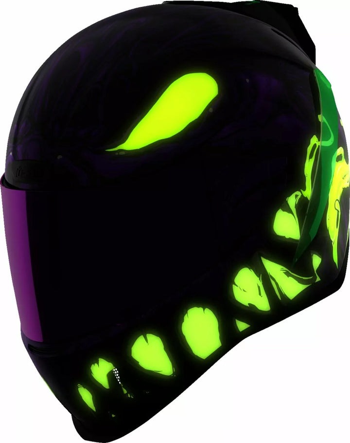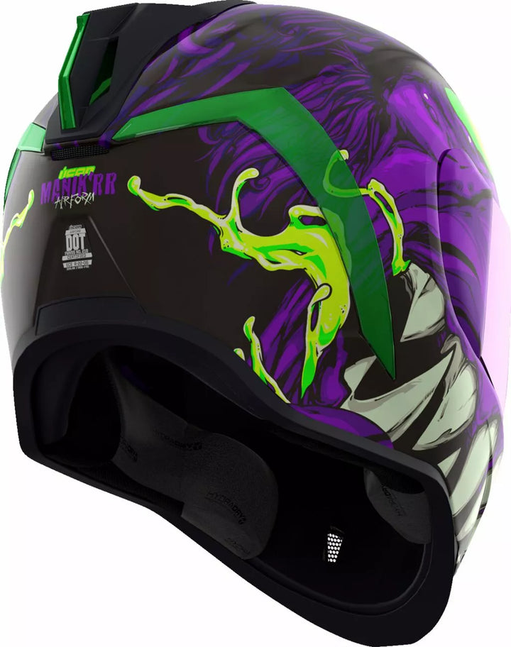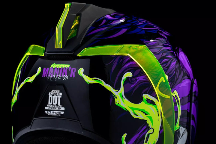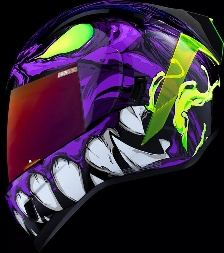 Continuous venting system, Fog-free ICON Optics™ Shield with Rapid-Release™ System, Injection molded polycarbonate shell for strength, Internal airflow geometry, Sculpted neck roll, Prolock™ positive shield locking system, Internal Dropshield™ with exterior switch, The Dropshield™ visor must only be used while the main face shield is in the fully closed position, Removable molded breath deflector, Removable Hydradry™ 3-piece moisture wicking liner, Internal speaker pockets work with ICON's R.A.U. Bluetooth device, Includes Dark Smoke DropShield™ and Rubatone Black Speedfin™