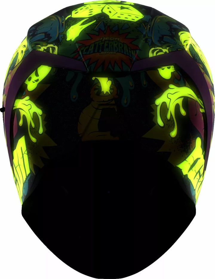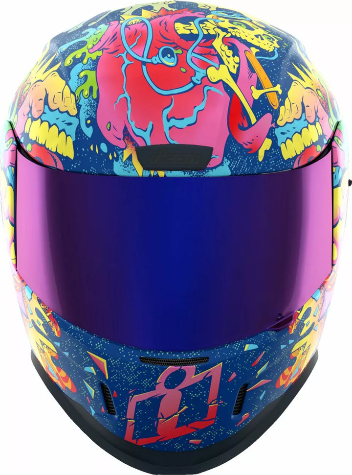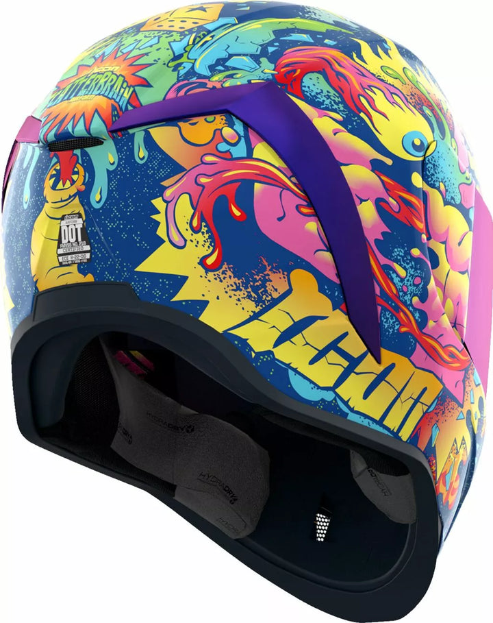 Injection molded polycarbonate shell for strength, Internal airflow geometry, Continuous venting system, Sculpted neck roll, Fog-free Icon Optics™ Shield with Rapid-Release™ System, Prolock™ positive shield locking system, Internal Dropshield™ with exterior switch, The Dropshield™ visor must only be used while the main face shield is in the fully closed position, Removable molded breath deflector, Removable Hydradry™ 3-piece moisture wicking liner, Internal speaker pockets work with Icon's R.A.U. Bluetooth device, Includes Dark Smoke Dropshield, Includes Clear & RST Purple Optics Shield™
