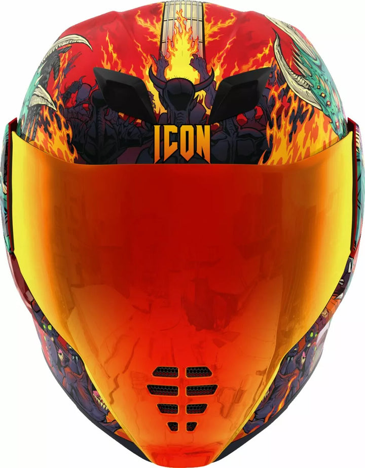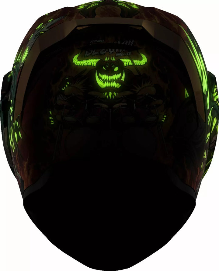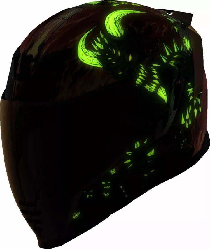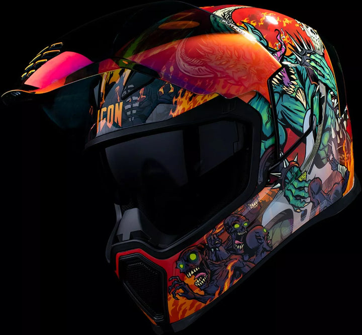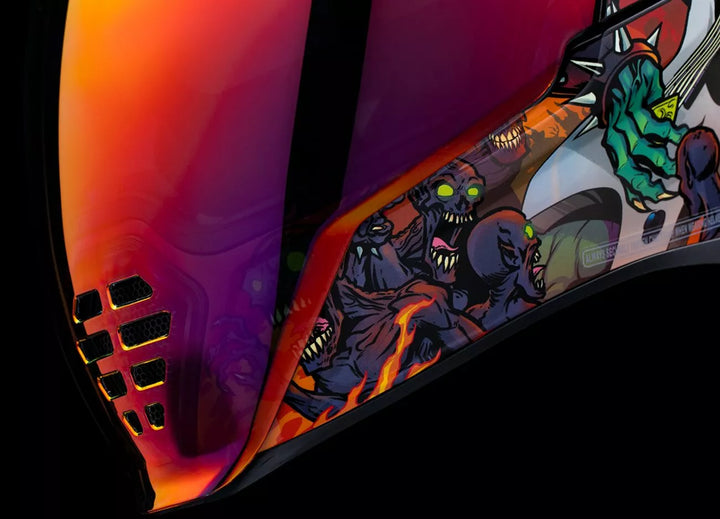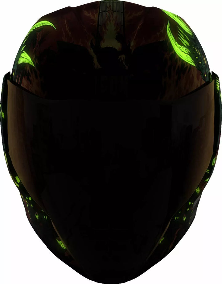 Removable molded breath deflector and chin curtain, Injection molded polycarbonate shell for strength, Fog-Free Dropshield™ with exterior switch, Recessed twin channel supervent cooling system, Multiple oversized intake and exhaust ports, Quick-change Fog-Free Fliteshield™ with side plates, The Dropshield™ visor must only be used while the main face shield is in the fully closed position, Removable Hydradry™ moisture wicking liner, Glow in the dark, Internal speaker pockets work with ICON's R.A.U. Bluetooth device, Includes Clear & RST Sunset fog-free Fliteshield™