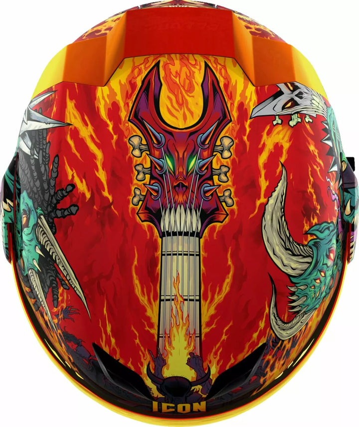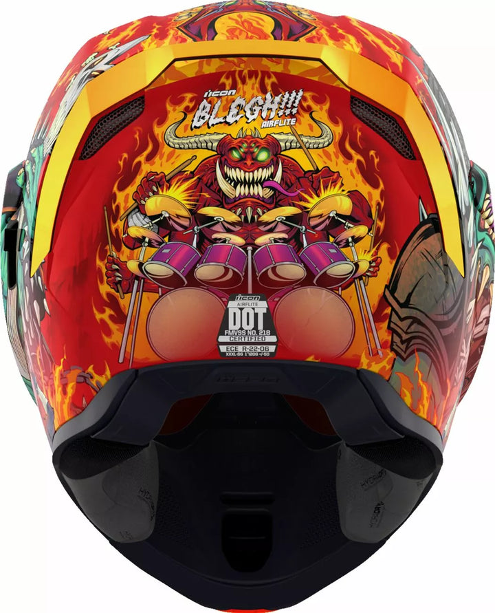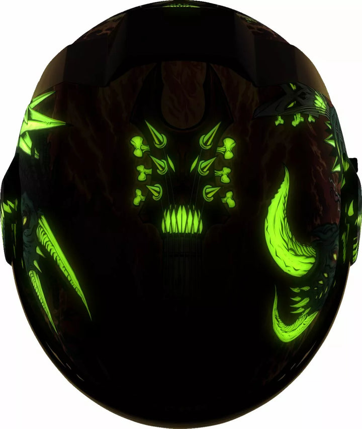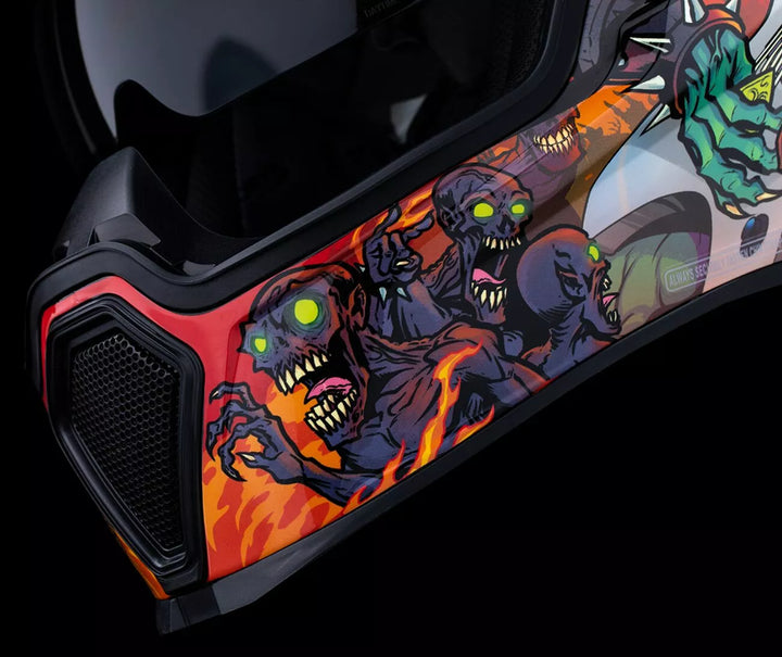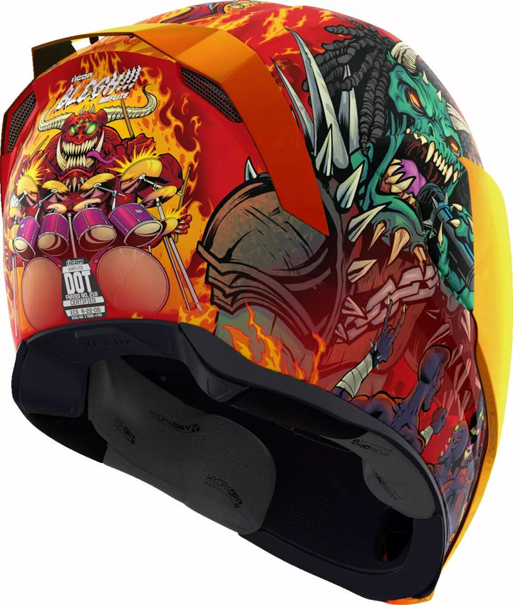 Removable molded breath deflector and chin curtain, Injection molded polycarbonate shell for strength, Fog-Free Dropshield™ with exterior switch, Recessed twin channel supervent cooling system, Multiple oversized intake and exhaust ports, Quick-change Fog-Free Fliteshield™ with side plates, The Dropshield™ visor must only be used while the main face shield is in the fully closed position, Removable Hydradry™ moisture wicking liner, Glow in the dark, Internal speaker pockets work with ICON's R.A.U. Bluetooth device, Includes Clear & RST Sunset fog-free Fliteshield™