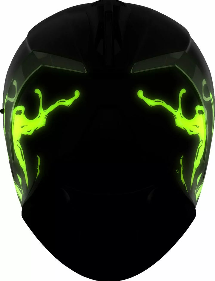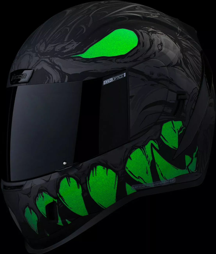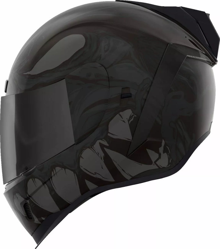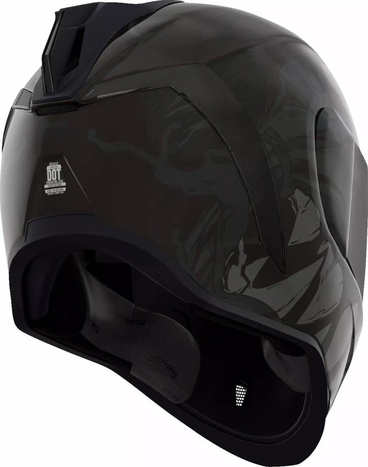 Continuous venting system, Fog-free ICON Optics™ Shield with Rapid-Release™ System, Injection molded polycarbonate shell for strength, Internal airflow geometry, Sculpted neck roll, Prolock™ positive shield locking system, Internal Dropshield™ with exterior switch, The Dropshield™ visor must only be used while the main face shield is in the fully closed position, Removable molded breath deflector, Removable Hydradry™ 3-piece moisture wicking liner, Internal speaker pockets work with ICON's R.A.U. Bluetooth device, Includes Dark Smoke DropShield™ and Rubatone Black Speedfin™