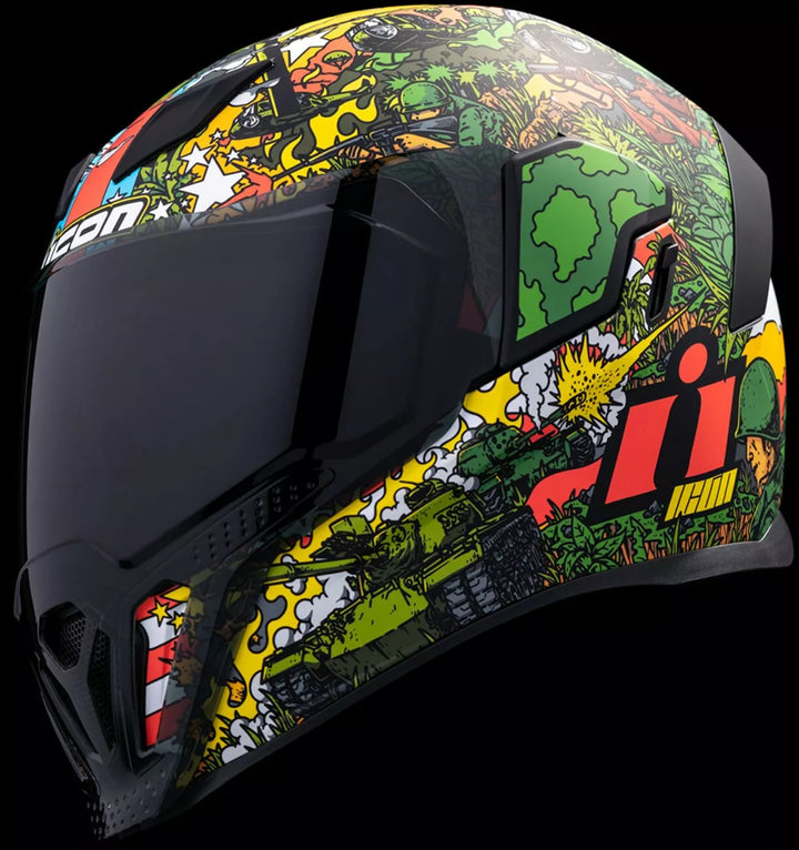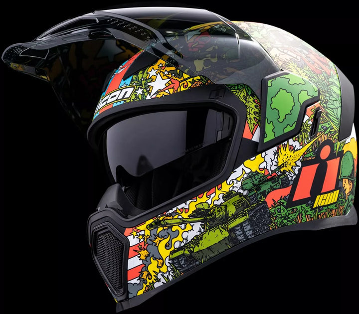 Quick-change Fog-Free Fliteshield™ with sideplates, Injection molded polycarbonate shell for strength, Multiple oversized intake and exhaust ports, Fog-Free Dropshield™ with exterior switch, Removable molded breath deflector and chin curtain, Recessed twin channel supervent cooling system, Internal speaker pockets work with ICON's R.A.U. Bluetooth device, The Dropshield™ visor must only be used while the main face shield is in the fully closed position, Removable Hydradry™ moisture wicking liner, Includes Clear Fliteshield™ & Dark Smoke Forceshield™, Includes Dark Smoke Dropshield™