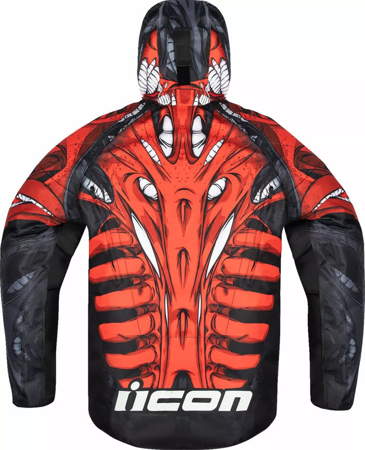 Airform Manik'r™ graphic on front and back of jacket, 420D Polyester chassis with 300D Polyester internal reinforcement, PU-Coated shell material with DWR finish, D30® removable Viper back protector; elbow and shoulder impact protectors, Bungee cord style drawstring hood, AirFly™ center front mesh panel with chest and back zippered vents , Vented cuff zippers, Back protector EN 1621-2 Level 1