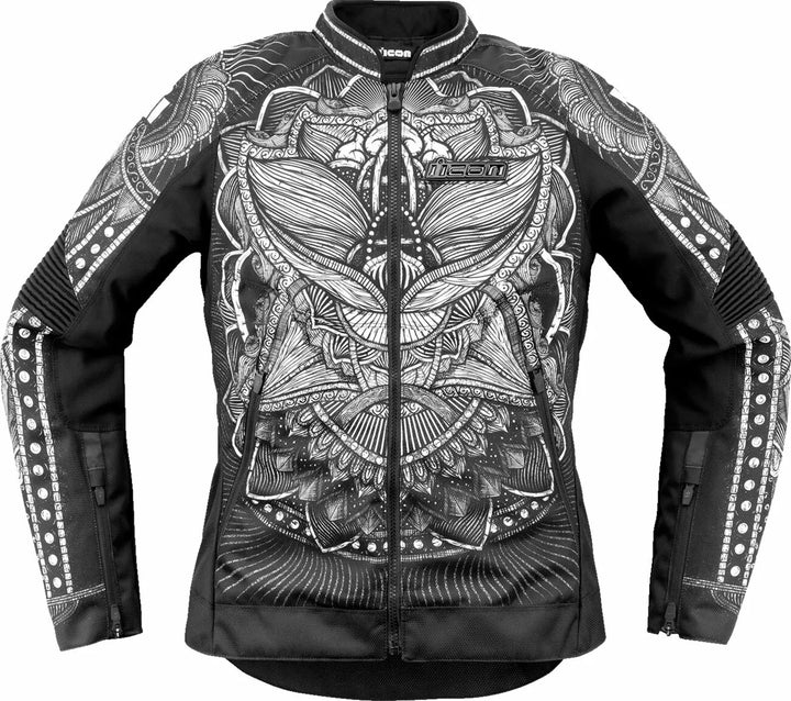 Women's Overlord3 Noble™ Jacket with allover graphics printed on a 1680D and 300D polyester chassis and internal 300D polyester reinforcements, ICON® Women's Sport Fit with pre-curved arms and shaped body, AirFly™ center front mesh panel with cuff vents, D30® removable Viper back protector; elbow and shoulder impact protectors, Removeable insulated vest liner, Back protector EN 1621-2 Level 1