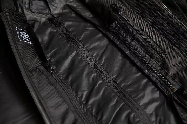 Durable leather and textile chassis, AirFly™ center front stowable mesh panel, Laser perforation at chest, Zipper vents at shoulders, cuffs, and back, Elastic expansion panels at elbows and upper back, Waist adjusters, Removable waterproof insulated liner, Back protector EN 1621-2 Level 1, EN17092-3:2020 – AA Class