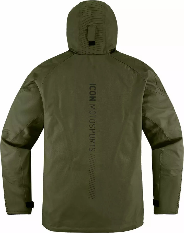 Removable insulated vest liner, Internal 300D polyester reinforcements, Hycor™ waterproof/breathable chassis, Oversized pit vents, ICON® relaxed fit, Roll and stow hood, Back protector EN 1621-2 Level 1