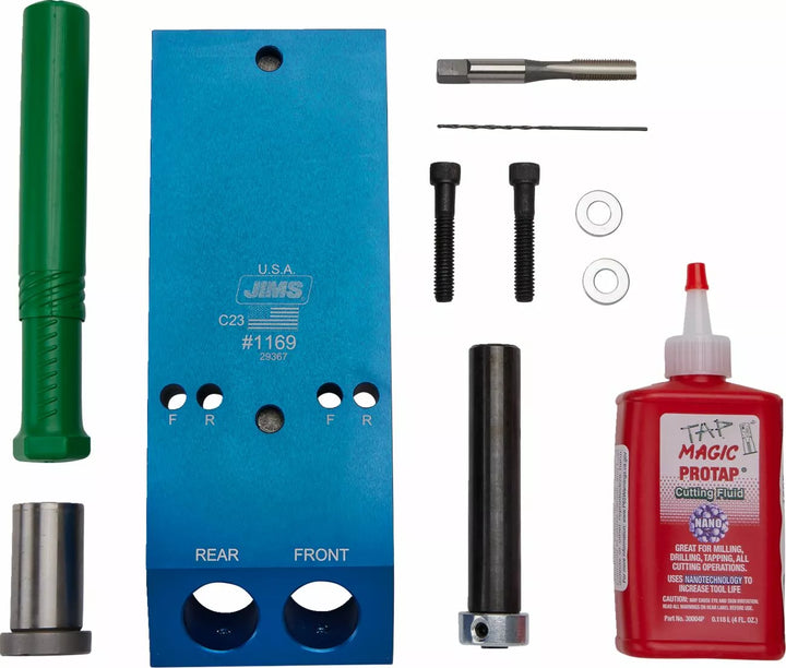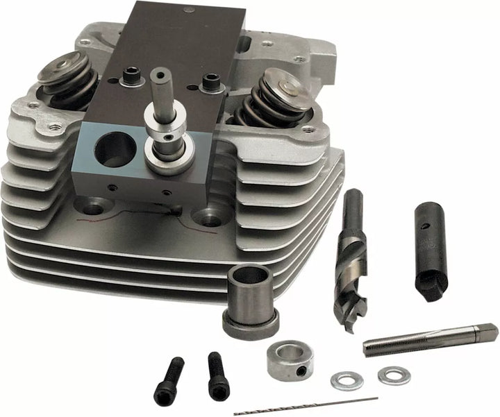 Installation kit includes fixture, drill bit, spot face bit and thread-tapping tool, Simply drill, spot face, tap and install compression release valves, Works on front and back head, with or without valves installed, For big-inch or high compression Twin Cams