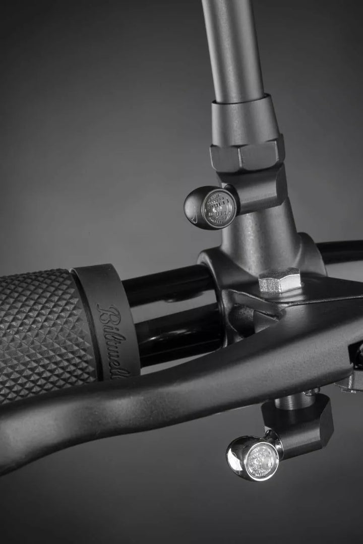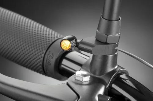Variable Mounting Adaptor M6., This adaptor offers a clean and easy solution for various mounting options and thus replaces an otherwise complex custom-made construction., It consists of two parts: A clamping sheet and a shank nut with an M6 internal thread. The clamping sheet, which can be shifted and rotated on the shank nut, is compatible with any M5 threaded lamp (Atto®, micro S, Rhombus S) at every angle., Due to the variances of this mounting the lamp can be installed in perfect alignment with the direction of traffic and is locked in place with grub screws. For example underneath the instruments., Simply replace the shaft nut of the brake or clutch lever by this shank nut., The clamping sheet can also be installed together with the handlebar mirror., Applications: micro 1000® & Rhombus.