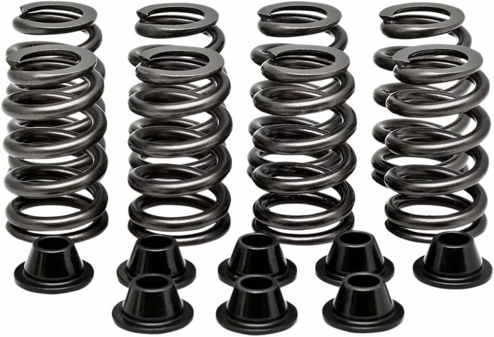 By taking advantage of the latest development in valve spring wire chemistry and manufacturing techniques, By coupling these developments with strict KPMIᆴ design protocols and employing multiple design simulation and FEA analysis software, we were we able to overcome the torsional stresses unique to ovate wire springs that previously limited their operating parameters. KPMIᆴ Beehive Springs are progressively wound using Kobe Super-Clean chrome silicon based wire that is heat treated and shot peened. KPMIᆴ uses its tightly toleranced, FEA designed hardened Titanium retainers in these applications to ensure correct assembly height and resist keeper pull through. The hardened steel basewashers included in these kits are designed to locate the spring and control lateral movement., KPMIᆴ has developed ovate wire Beehive style springs that will live and perform at a high level in Husqvarnaᆴ and KTMᆴ applications.