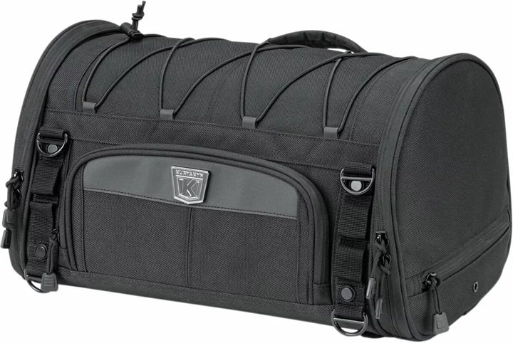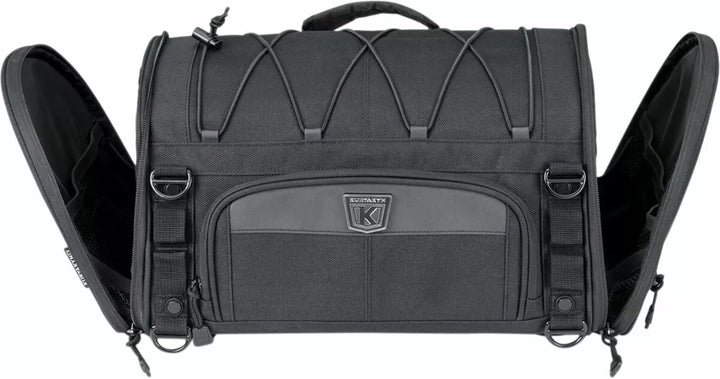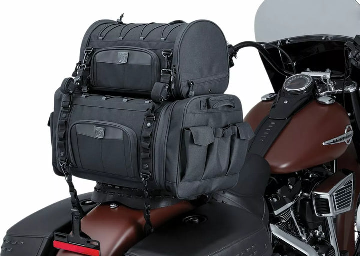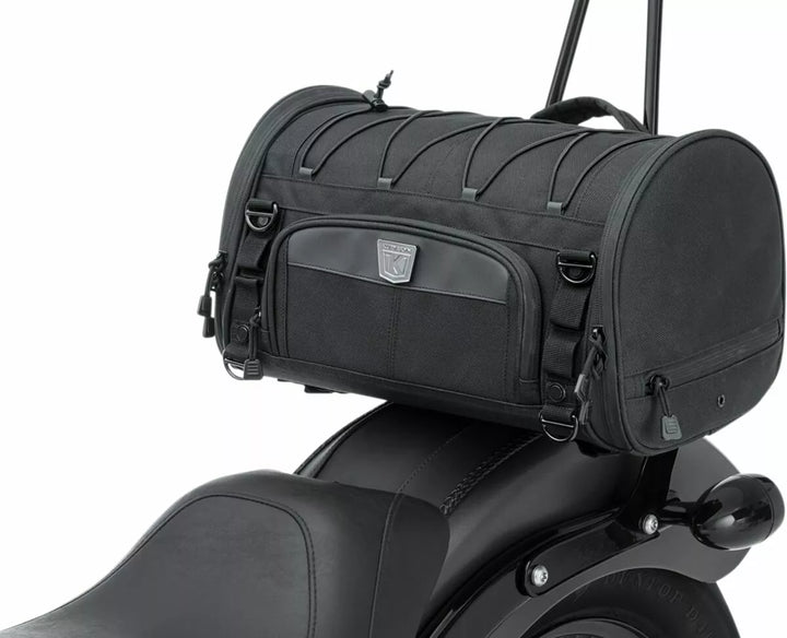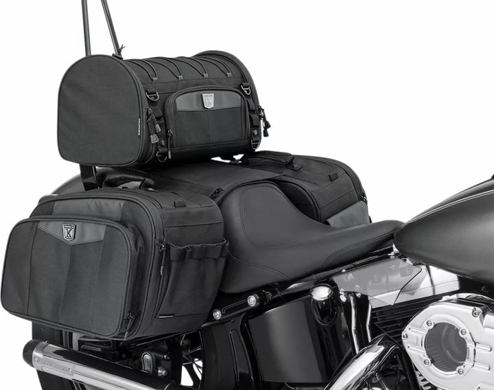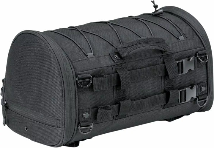 UV-rated, weather-resistant 1200 denier textile construction with removable rain cover, Bottom-mounted tie-down loops for easy mounting on luggage racks or Momentum Drifter (P/N 5283), Road Warrior (P/N 5284) and Vagabond (P/N 5285) bags, all sold separately, Convenient side entry doors to easily access items while mounted, Front stash pocket for easy access to small items, Quick-mount sissy bar strap design for secure mounting in seconds, External adjustable bungee storage system for coat, bedroll or other items, Integrated MOLLE modular attachment points, Low-profile carrying handle plus removable shoulder strap for easy portability off the bike, Rigid structure retains its shape whether loaded or empty, Multiple D-Rings for additional easy and secure mounting options, Dimensions: 15.5" wide x 9" tall x 9.25" deep, Cubic Inches: 1,290, EU measures: 39,37 cm W x 22,86 cm T x 23,50 cm D, EU capacity: 21,14 L