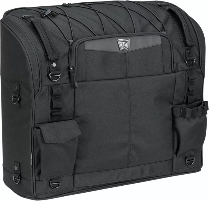 Ideal for the passenger seat of a touring bike with trunk, Padded face/front for additional back support for the rider, Adjustable internal mesh dividers partition the internal compartment, creating three separate storage spaces, Three xternal quick-stash pockets, including forward-facing bottle pocket, Padded media storage for up to a 15" laptop or tablet, Durable structure holds shape even when empty, Included shoulder strap and low-profile carrying handles offer easy portability off the bike, Multiple heavy-duty D-Rings offer secure mounting options, Includes rain cover for added protection from the elements