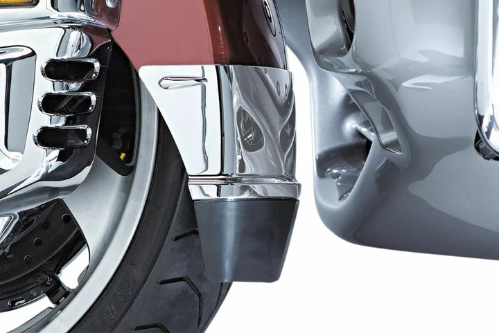 Easy install on stock front fender, even if the Honda extension has been previously installed, Extends the fender a full 4" to help keep rain spray and road grime away, Chrome finish with black rubber lower tip