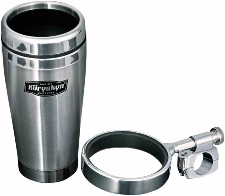 Clamps to the handlebar or the clutch/brake perch and holds an average-size cup, can, bottle or mug, Quick-detach mount leaves a simple clamp when not in use, Clamp allows beverage to swivel when needed, Stainless steel mug with mounting ring