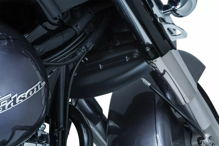 Directs wind passing between the fork legs downward, Reduces upward airflow between the tank and fairing, For models with ABS