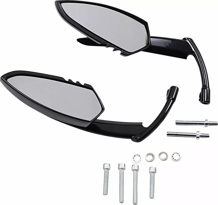 Mirror stem evokes the look of a sickle., Mirror head resembles a survival knife., Stem and mirror head are joined by a smooth-operating ball and socket joint mechanism for easy adjustment., Mirror head measures 5-1/2" x 2"., Cast aluminium construction.