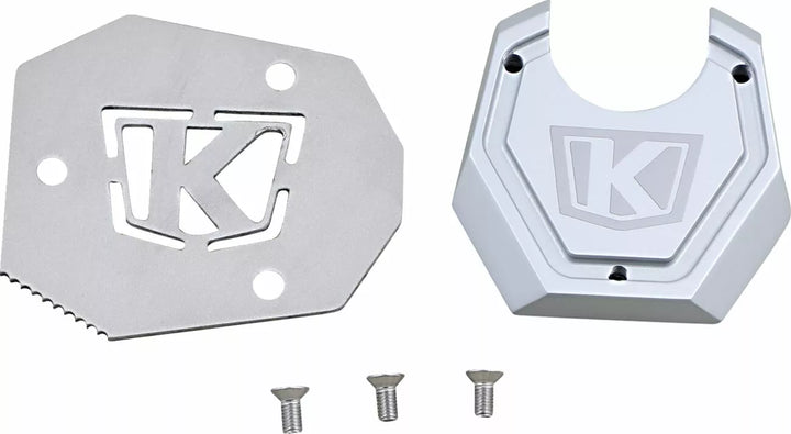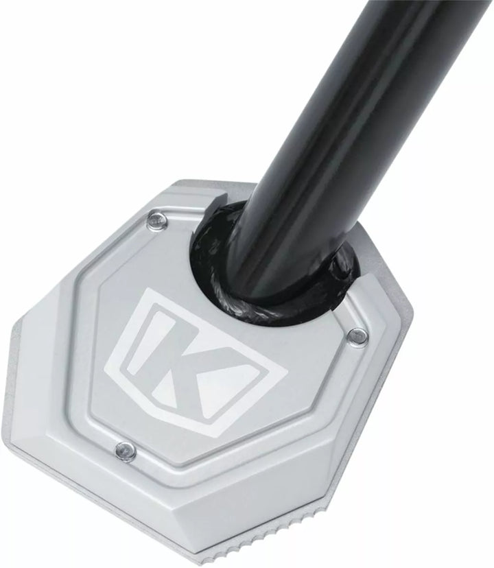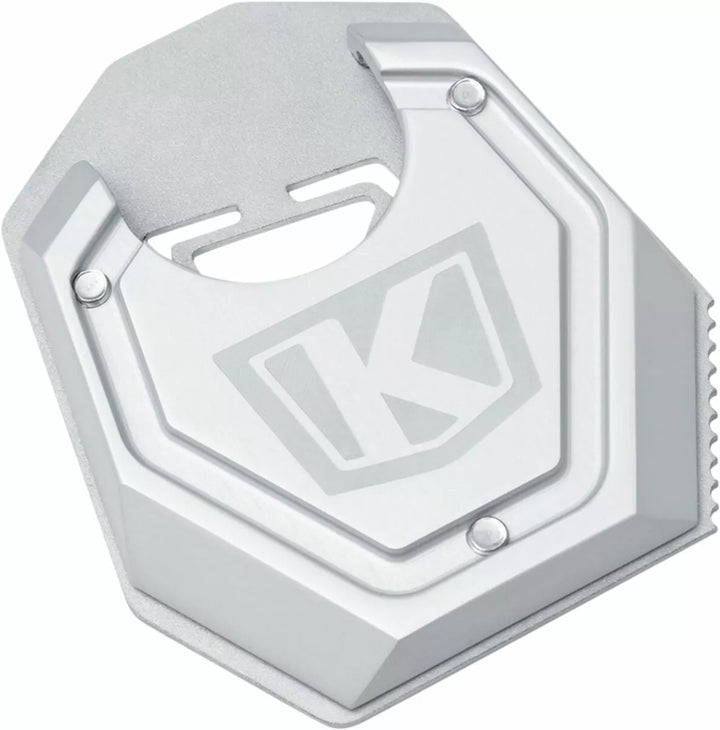 Provides additional surface area to keep kickstand from sinking into soft surfaces, CNC machined 6061-T6 Aluminum top with laser-cut stainless steel bottom plate, Outer edge can be utilized to break beads on flat tires during roadside or trailside repairs, Serrated edge on the bottom plate ads traction to help deploy kickstand in wet or muddy conditions, Includes three M5 screws