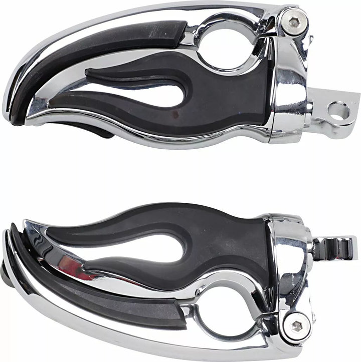 Feature a flip-out arm for use as a heel rest, Add comfort on long rides, Heel rest has curb feeler tabs on underside, Come with male-mount ends, Flip-out arm is designed only to be used as a heel rest, Pegs without ends require motorcycle-specific adapter mounts