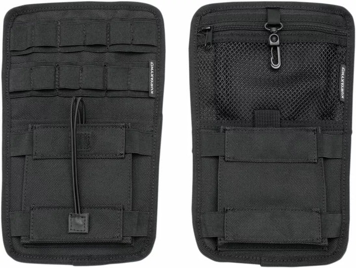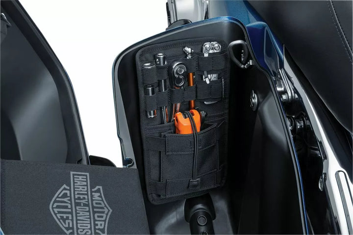 Will mount on the inside panel of any OEM hard bags with a depth greater than 11 inches, Zippered pockets keep small items secure and in an easy-to-find location, Expandable pocket for water bottles or other larger items, Elastic MOLLE modular attachment points for tools, pens, pocket knives or other items, Slip pockets for map or phone storage, Dimensions: 7" wide x 11" tall, EU: Will mount on the inside panel of any OEM hard bags with a depth greater than 27,94 cm, EU: Dimensions 17,78 cm W x 27,94 cm T