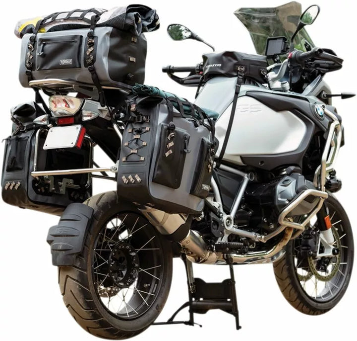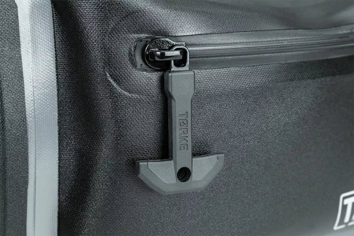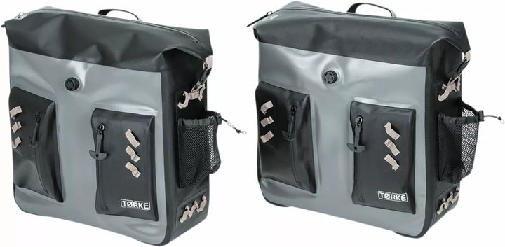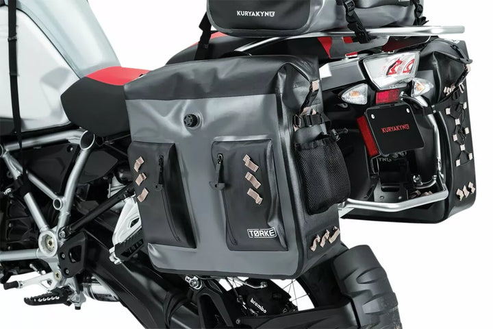 Tørke 24L Dry Panniers are extremely lightweight, Fully waterproof, RF-welded double-coated TPU construction, Submersible IPX7-rated zippers with lockable pulls, Removable hi-vis internal support structure with hook-&-loop storage pouch for small items, Internal neoprene pockets for laptop or tablet storage, Integrated ai/purge valve, External waterproof storage pouches with IPX7 lockable zipper pulls, Includes full mounting strap kit and removable cargo nets for exterior storage, Throw-over versatility with a full mounting strap kit and variety of secure tie-down points, Recommended for use with saddlebag support brackets if secure four-point mounting strap system cannot be achieved