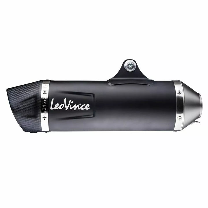 NERO EXHAUST SYSTEM, Aggressive style and sharp lines., LeoVince Nero is the muffler for motorbikes and maxi-scooters with a dark and modern look, the result of LeoVince's constant research of quality steels and exclusive processes., FEATURES, ASSI 304 Stainless Steel Sleeve, Carbon End Cap with Matte Clear Coating for UV Resistance, Metallic Ceramic-Based Black Paint, Matte Finishing, Laser Etched LeoVince Logo