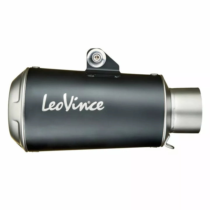LV-10 BLACK EDITION SLIP-ON MUFFLER SS WITH RACING DNA, With the Black Edition, LeoVince presents a wonderful shade of black to dress your motorcycle in: a ceramic-based and high temperature resistant paint dedicated to lovers of aggressive tones., AISI 304 stainless steel, Shot blasted end cap, Metallic ceramic-based black paint with a matte finishing, Rear stainless steel mesh, Laser etched LeoVince logo, Laser cut bracket, High temperature resistant "LV" sticker included in the box