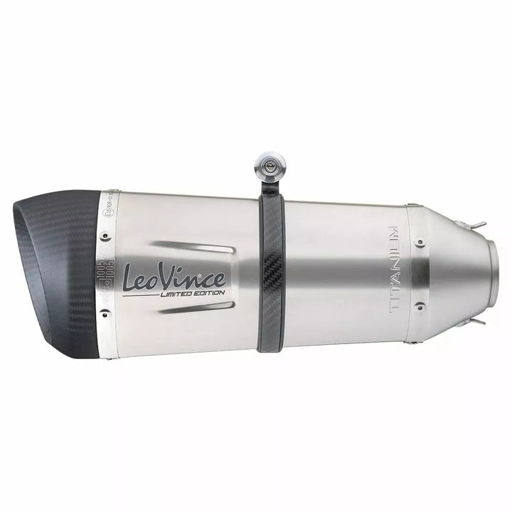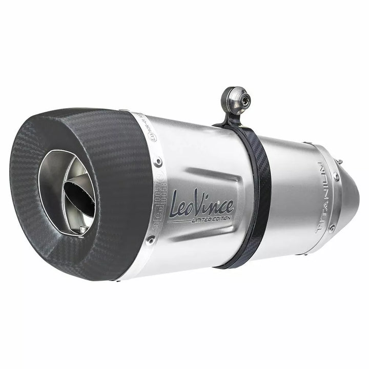 FACTORY S TITANIUM SLIP-ON MUFFLER, The lightness of titanium and carbon fiber: LeoVince has combined these two elements together and has created a series of "Limited Edition" exhausts., The exhaust outer sleeve of the "Titanium Limited Edition" is entirely made of Titanium Grade 1; the end cap is in carbon fiber, embellished with a matte clear coating for an even more refined look and to ensure maximum UV resistance., The fastening strap is also in full carbon., Features, Titanium Grade 1 outer sleeve, Full carbon end cap with matte clear coating, Full carbon fastening strap, Laser-etched "LeoVince" and "Limited Edition" logos, Debossed "Titanium" logo