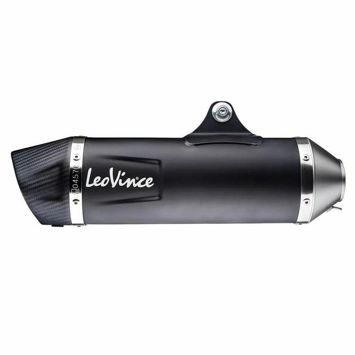NERO Join the Dark Side, Aggressive style and sharp lines., LeoVince Nero is the new muffler for motorbikes and maxi-scooters with a dark and modern look, the result of LeoVince's constant research of quality steels and exclusive processes., Features, AISI 304 stainless steel sleeve, Full carbon end cap, Metallic ceramic-based black paint, Matte finishing, Laser etched LeoVince logo