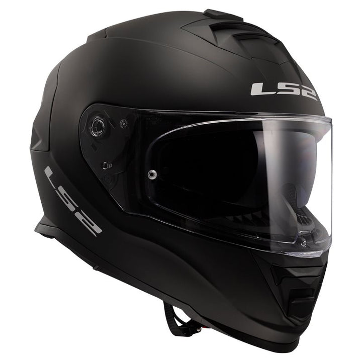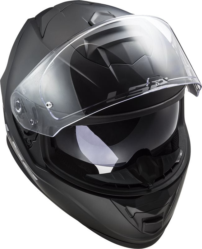 Frontal vy av LS2 Integral Mc-Hjälm Storm II Matt Svart med klar visir och ventilationsöppningar för optimal komfort och säkerhet.