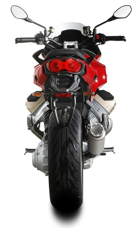 GP PRO, manufactured by semi-handmade TIG welding, shows a compact and essential design and an aggressive sound. Inspired by the world of competition, the exhaust pipe is equipped with a removable protective grille that hides the dB-killer. This muffler sports the characteristic Mivv logo created by laser technology.